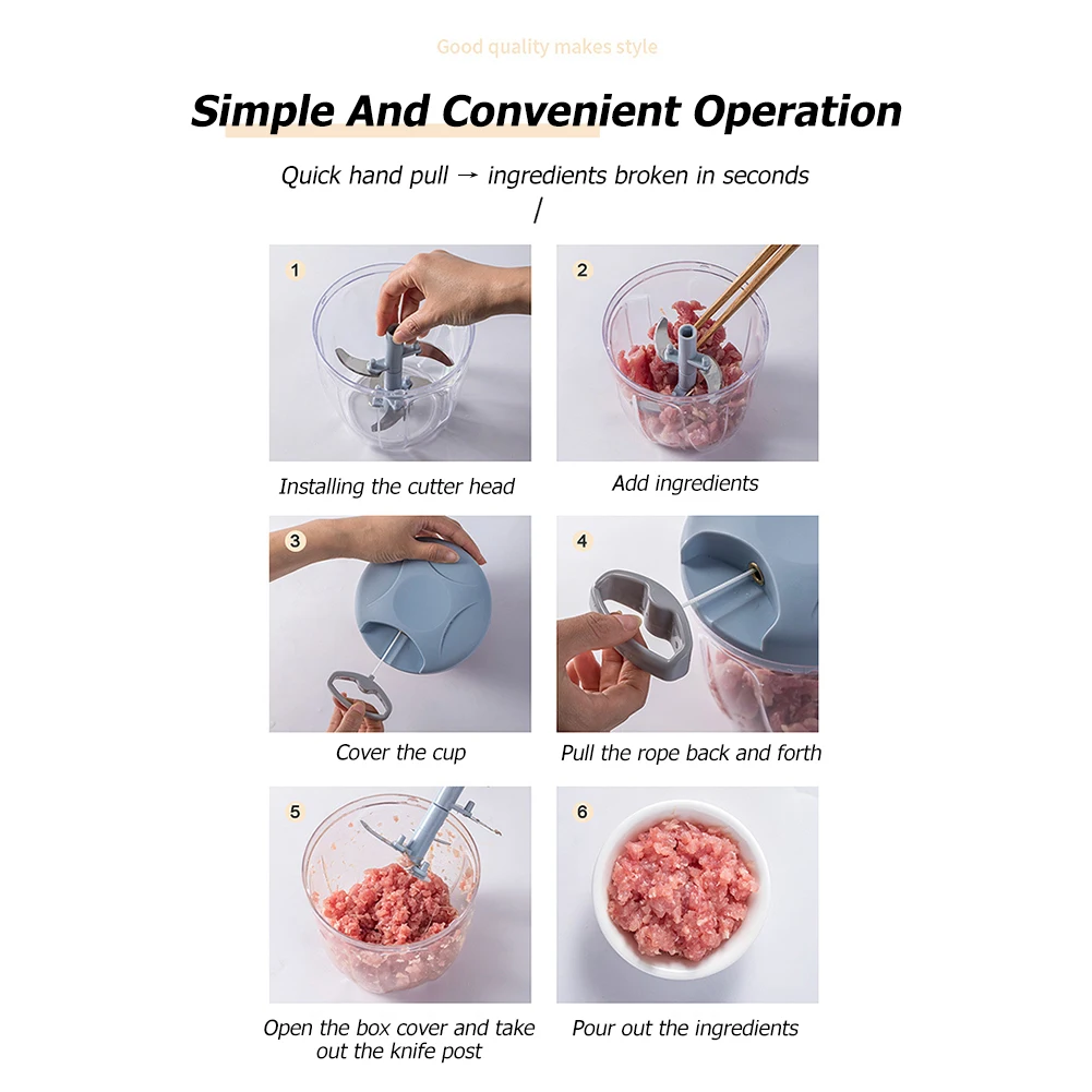 Modo de usar: O triturador manual é bem simples de ser utilizado, basta pôr os alimentos no reservatório que o mesmo possui, e fecha-lo, puxar a corda cerca de 5 vezes e estará concluído, a densidade ou a consciência por ser contida simplesmente através do número de vezes que a corda for puxada. Especificações: Material: aço inoxidável ABS Cor: Rosa, azul, verde